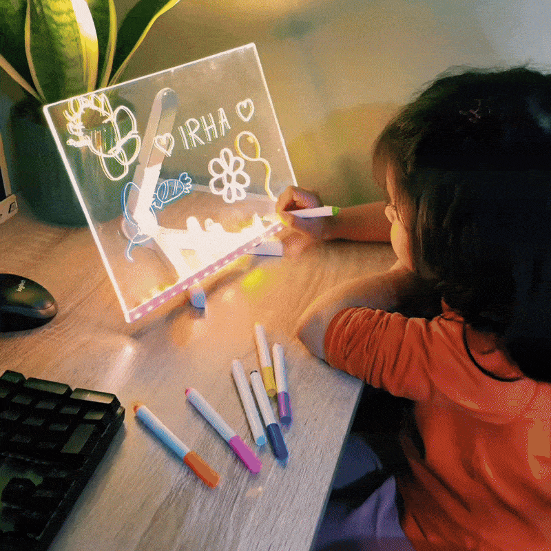 The Sprout Board is a glowing acrylic drawing board designed to spark imagination and make creativity shine. Kids can draw, write, or doodle directly onto the clear board using the included neon markers. Once the board lights up, their artwork glows like magic, turning simple sketches into bright, colorful creations.